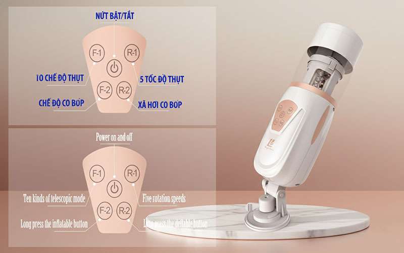 - Chức năng: Tổng hợp 20 chế độ bú mút cực đã và đặc biệt có nút F2 chỉnh co giãn phần ruột chật rộng tùy theo kích thước dương vật người sử dụng.